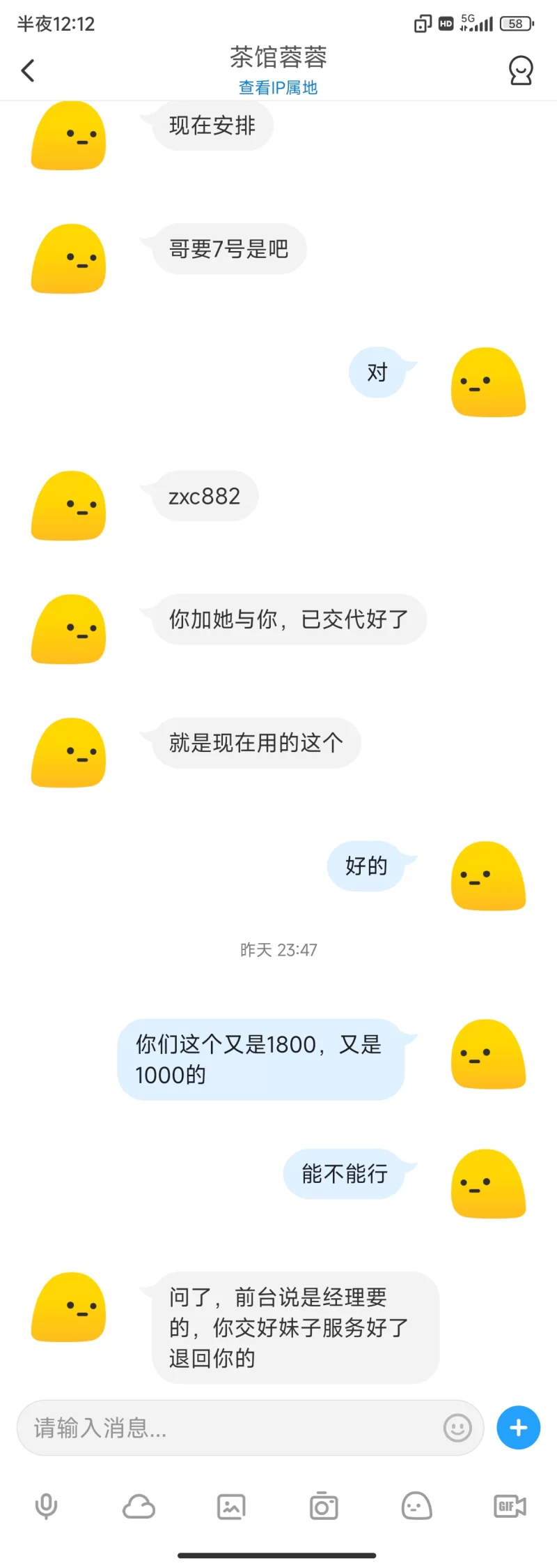 来黄山旅游,想着玩一下,打算第二天去宏村玩,现在看看附近有没有,问到一个有外卖的,第二天到了,晚上想叫过来了,当时因为问的时候那几个都说要交300押金才能来,我想着以为是这里都这样,也就交了,就从这个第一次开始一发不可收拾,我想不能这300打水漂啊,就一直给到了1100的服务费,然后通知妹子来了(来没来我也不知道)来了后,跟我说要交1800的保证不拍视频费当押金,当时我就感觉不对,我说我人都没见着又是1100加1800的,我直接下楼去找他人,她说规定不能见,发了个共享位置,我当时也是精虫上脑,shabi的给了,给我跟我说他们老板打电话说今天查的让回去,问我要了个收款码,说退我钱,我当时还sb呵呵的以为正能退,到晚上11点多了,给我发信息说现在又可以了,(其实当时已经回过味来了,感觉被骗了,但现在钱都给了,就当被骗了,但现在又发信息说可以了,就让他来吧,钱都付了,退不退还两说呢)结果来了说要再交1000保证戴套做,我直接去nmd。这事也看出来了人真不能精虫上脑啊,唉!
