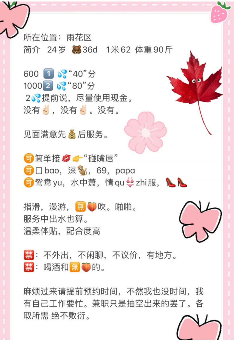 服务项目:深喉、接吻、69、鸳鸯浴、指滑、情趣制服