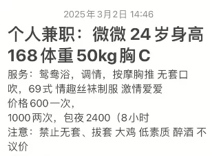 服务项目:鸳鸯浴,调情,按摩,胸推,无套口吹,69式,情趣丝袜制服,爱爱