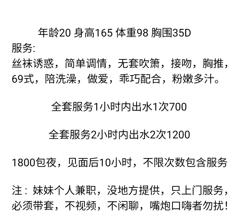 凡是有要求路费/定金/保证金/照片验证/视频验证等任何提前付费的行为,千万不要上当。同时也请注意仙人跳,在寻欢前不要露富和带过于贵重随身物品。本站为分享信息并不对寻欢经历负责,碰到有问题的信息,请及时举报给我们删除信息。