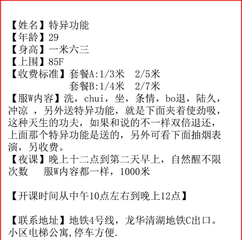 凡是有要求路费/定金/保证金/照片验证/视频验证等任何提前付费的行为,千万不要上当。同时也请注意仙人跳,在寻欢前不要露富和带过于贵重随身物品。本站为分享信息并不对寻欢经历负责,碰到有问题的信息,请及时举报给我们删除信息。